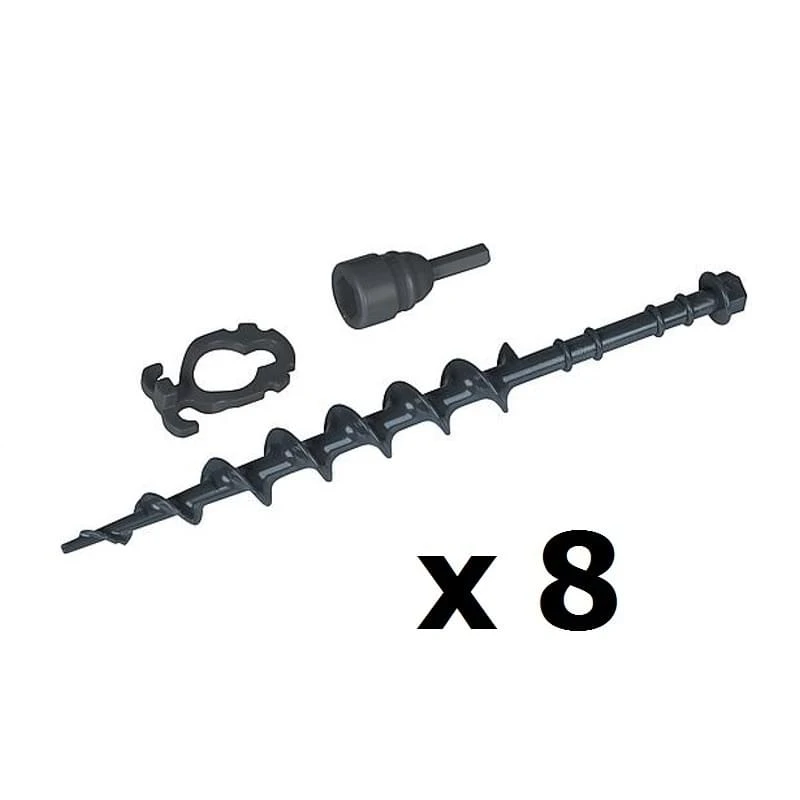 Deze schroefharingen set van Bo-Camp bevat 8 haringen met bijbehorende clips en 2 boormachine adapters. Deze haringen zijn geschikt voor zachte tot middel-harde ondergronden. De schroefharingen kunnen eenvoudig de grond worden ingedraaid met een (accu)boormachine door gebruik te maken van de meegeleverde adapters. Met de clips kunnen scheerlijnen nog eenvoudiger en steviger aan de haring bevestigd worden. Doordat de haringen van een sterk soort kunststof zijn, wegen deze ook een stuk minder dan stalen haringen.