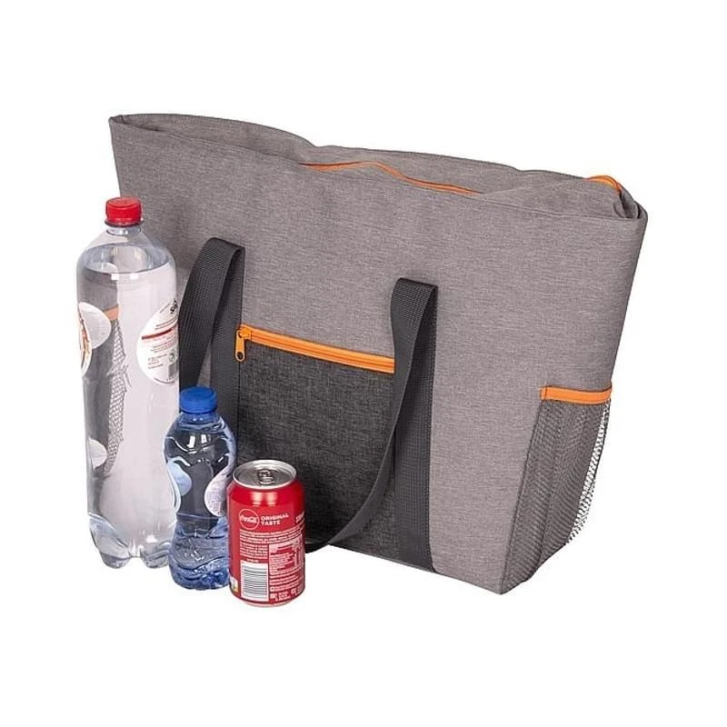 De koeltas heeft een inhoud van 12 liter en is voorzien van een voorvak met rits en 2 mesh zijvakken. De buitenzijde van de koeltas is gemaakt van een stevige laag Oxford polyester in 2 verschillende tinten grijs.