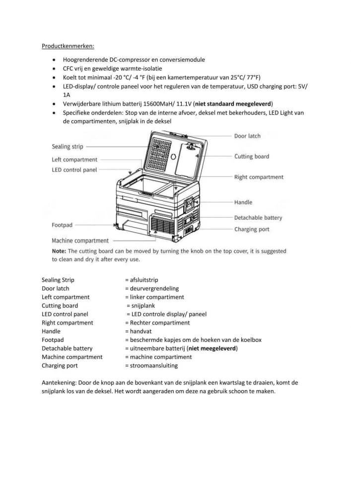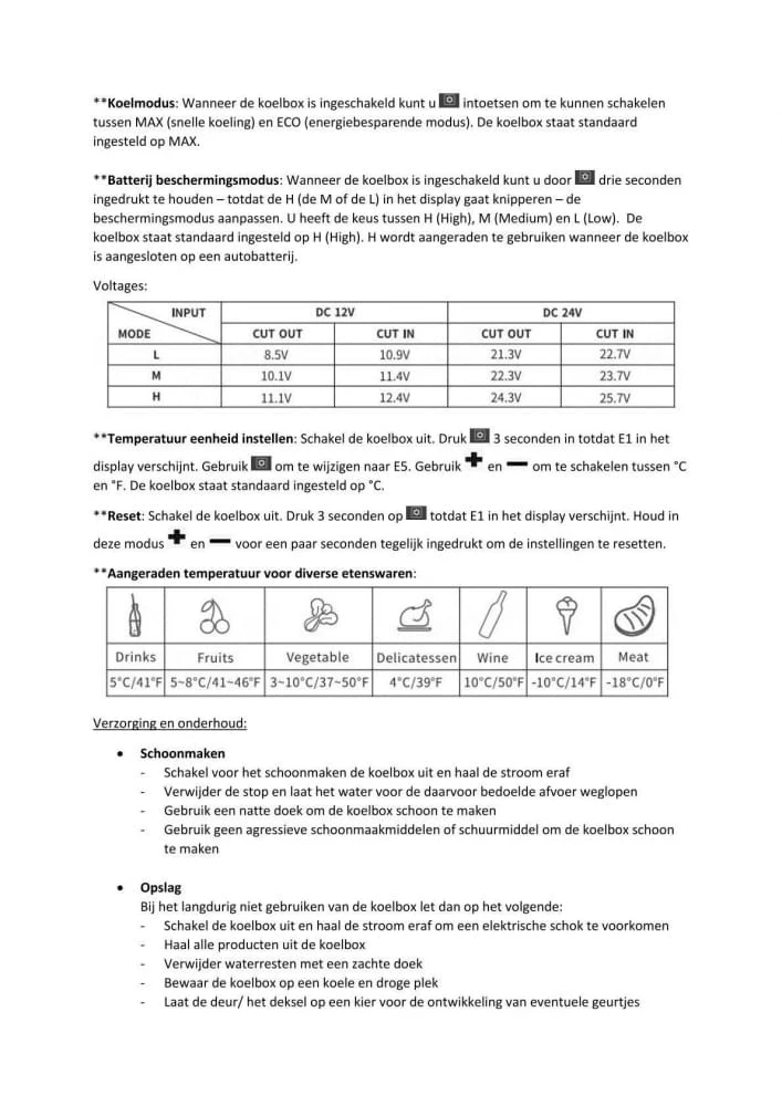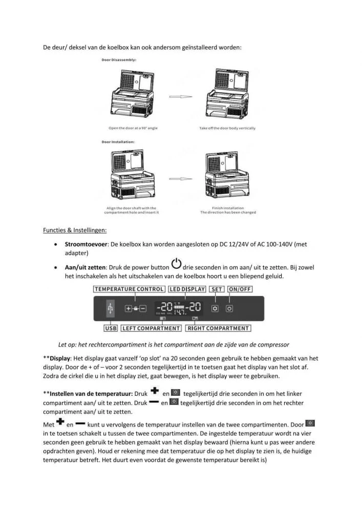 Daarnaast is het instellen middels het digitale display zo gebeurd en is een ander groot voordeel dat de koelbox weinig geluid produceert (<45db). De koelbox werkt op zowel 12, 24 en 230V en wordt geleverd met twee adapters. Eén geschikt voor 12V en één geschikt voor 230V.