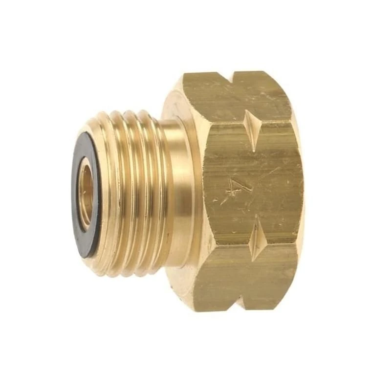 De messing verloopnippel van Gimeg heeft een Shell binnendraad en een DIN buitendraad.