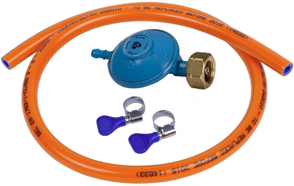 Met dit installatie-setje 150cm kan je een willekeurig gastoestel aansluiten op een gasfles. De set bestaat uit een drukregelaar van 30 mbar, 150 cm gasslang en 2 slangklemmen.