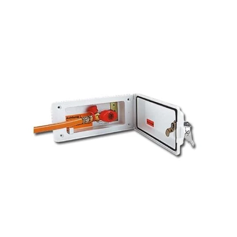 De verzorgingskast gas van Reich is voorzien van een veiligheidsventiel en slot. De gasaansluiting voldoet aan de DVGW 80.08.E140 veiligheidsnormen. De verzorgingskast is een aansluitkast voor gas om in de caravan- of camperwand in te bouwen. Het is een snelle en gemakkelijke manier om ook in je voortent of onder de luifel een aansluiting te hebben waar je je gasapparatuur op aan kunt sluiten. Denk hierbij aan bijvoorbeeld een kooktoestel, de skottelbraai, een barbecue en kachel.