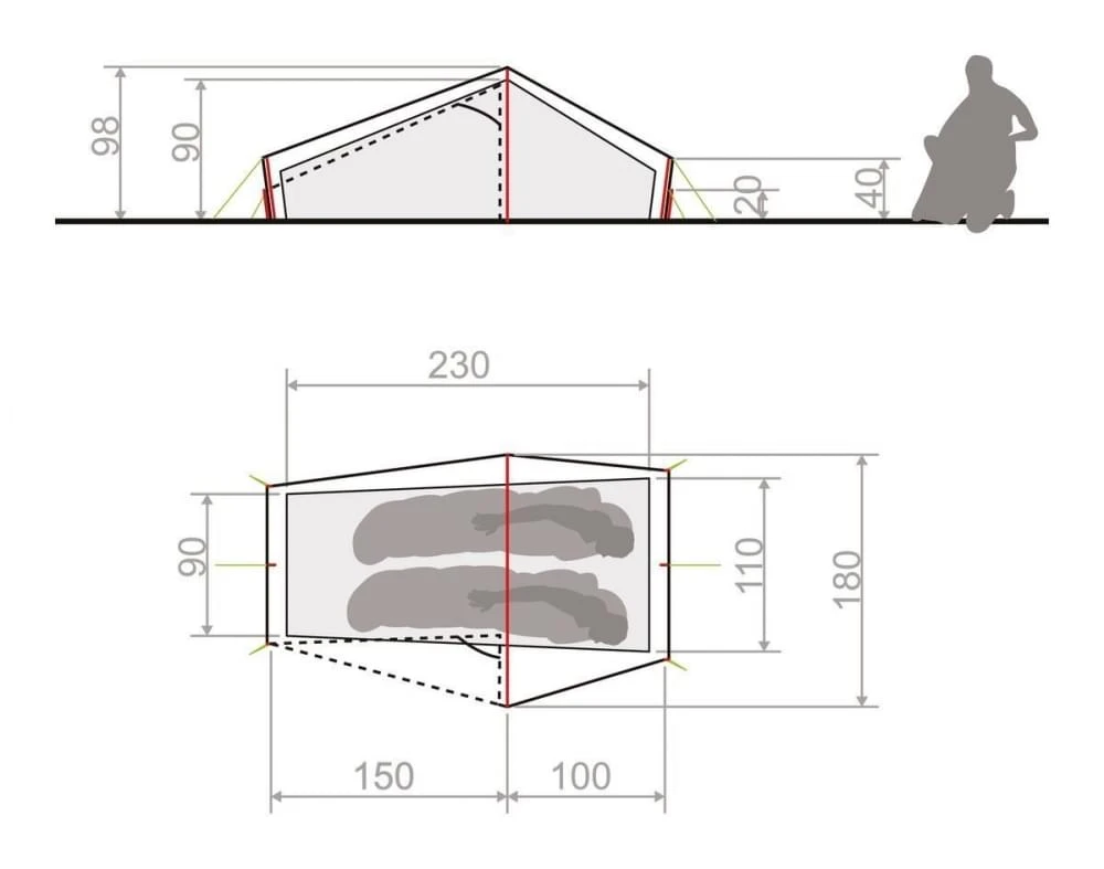 - Binnentent: 100% Nylon 15D Mini Ripstop, 20D No-See-Mesh Polyester